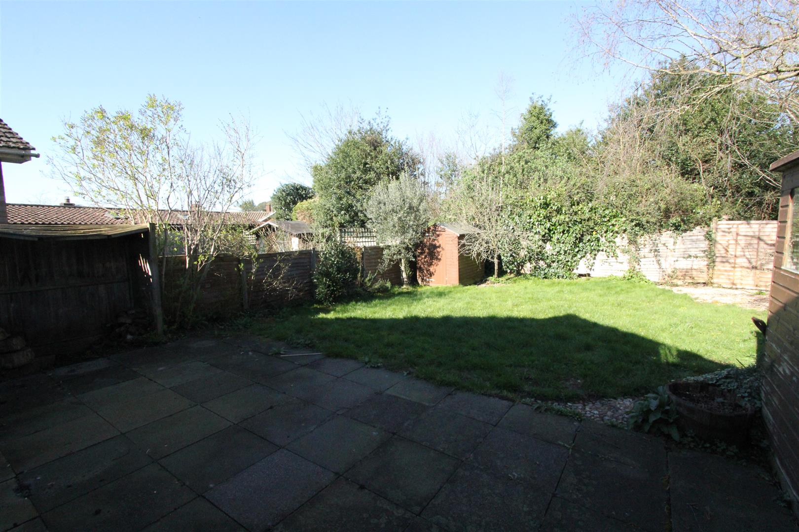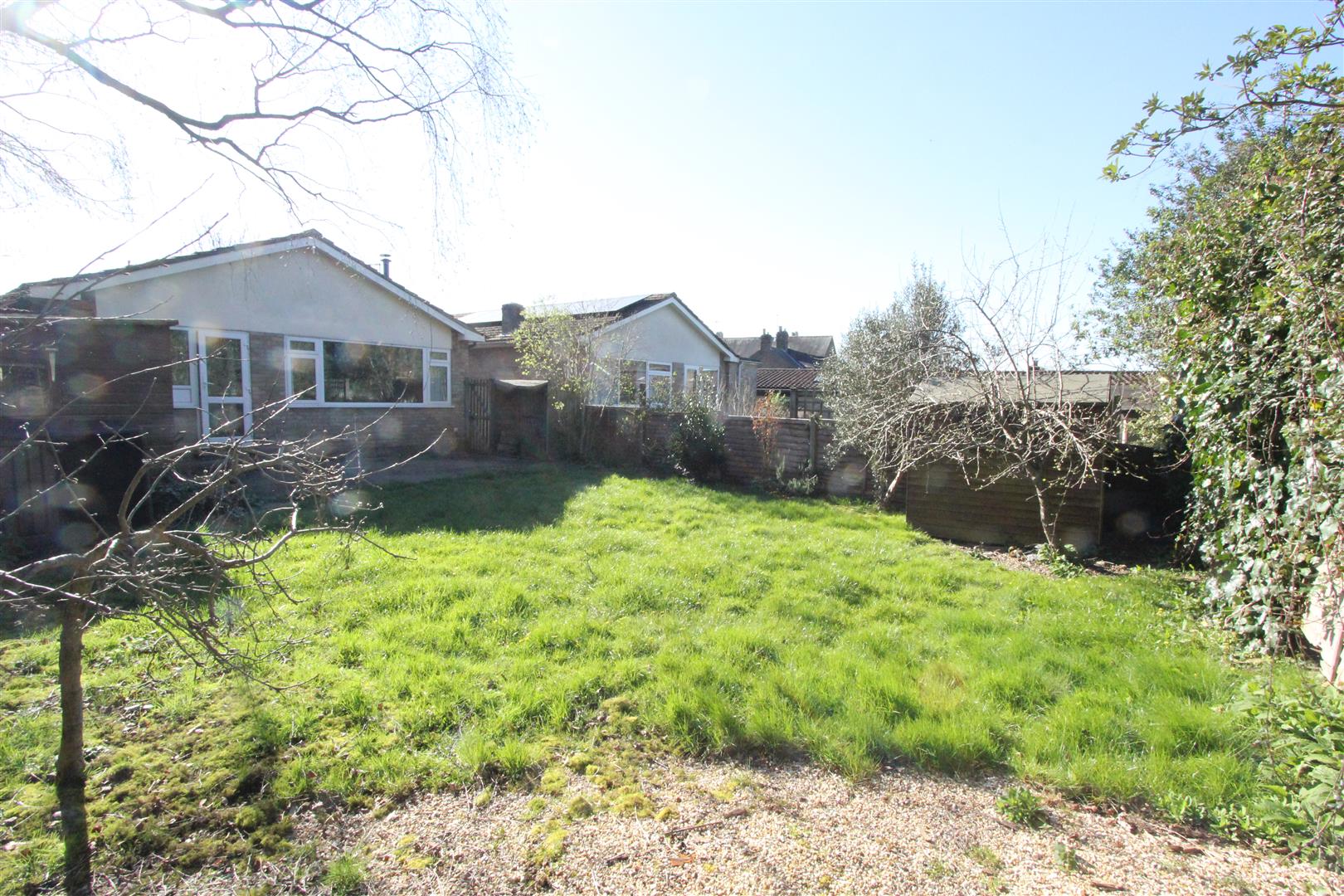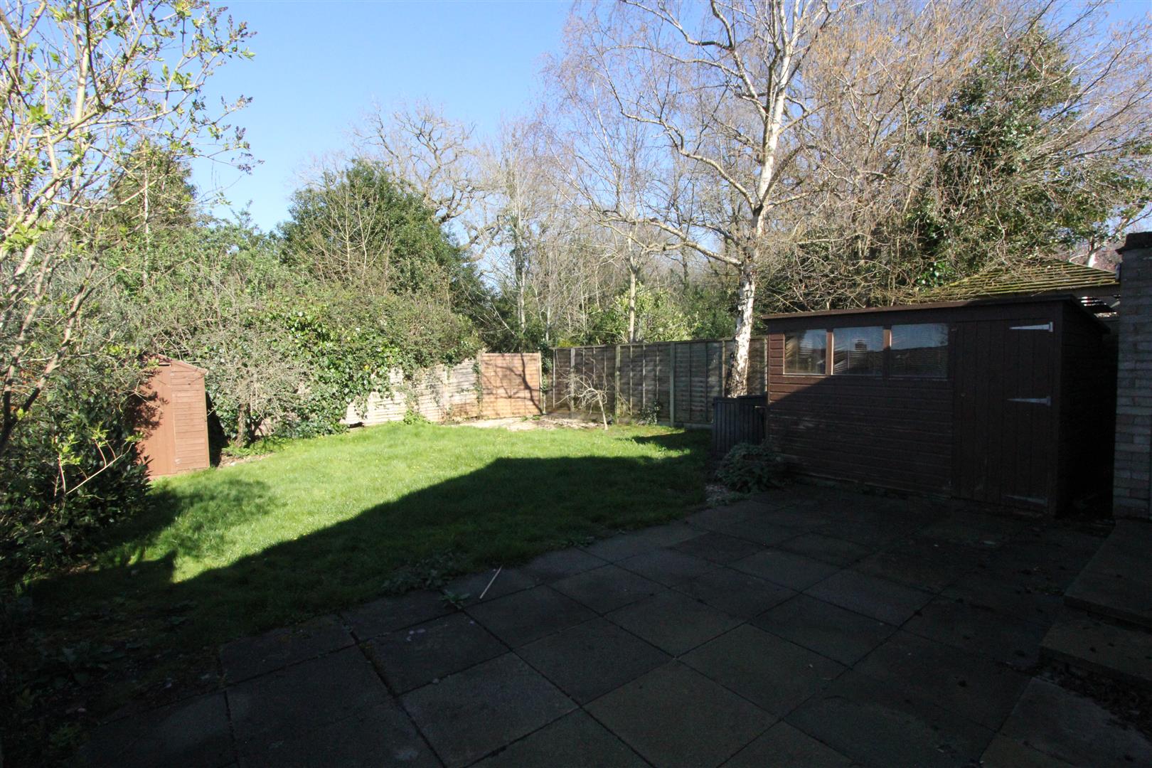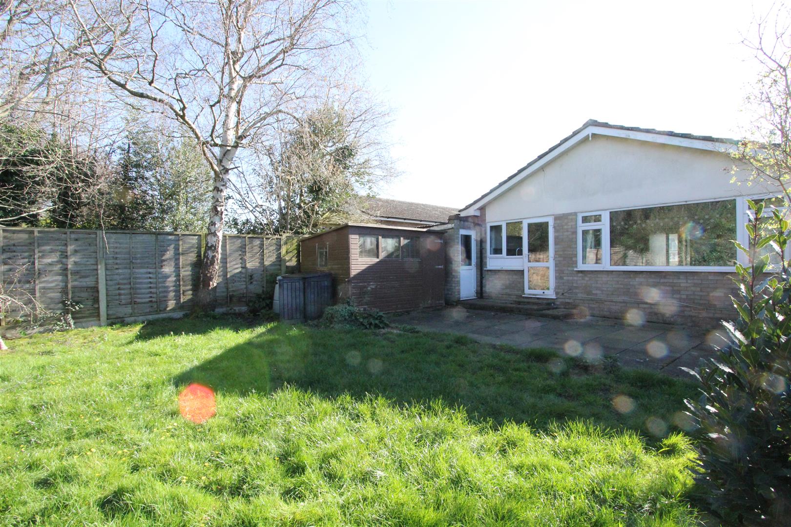 The bungalow has a driveway with space for two or more cars running up past the front garden to the GARAGE: 17'6 x 8'3 with garage door to front, electric light/power, two garden taps, plumbing for a washing-machine and a glazed door to the back garden. There is a path down the side, shared with next door, leading to a gate into the back garden which is a good size with central lawn, mature tree, fencing for privacy and two garden sheds.
