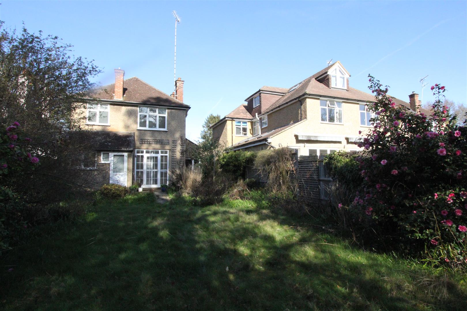 The property has a large front garden with lawn and driveway with space for three cars leading up to the GARAGE: 18'3 x 11 with garage door to front and door to garden at the rear. The back garden is c.160 feet long with central lawn, flowerbeds, mature shrubs and trees.