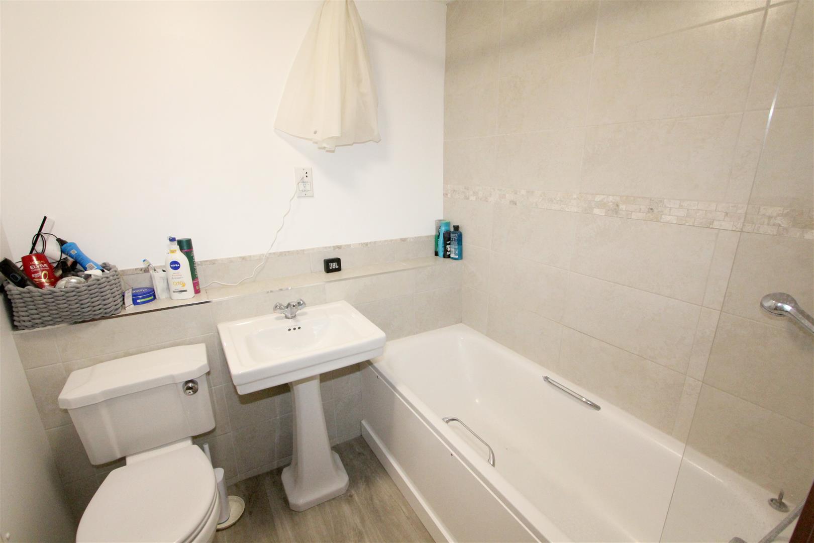 Bathroom - 2.18m x 1.91m (7'2 x 6'3)Panel bath with electric shower above. Low-level WC. Wash-hand basin. Double shaver socket. Tiled walls. Wood-effect vinyl floor. Modern heated towel-rail.