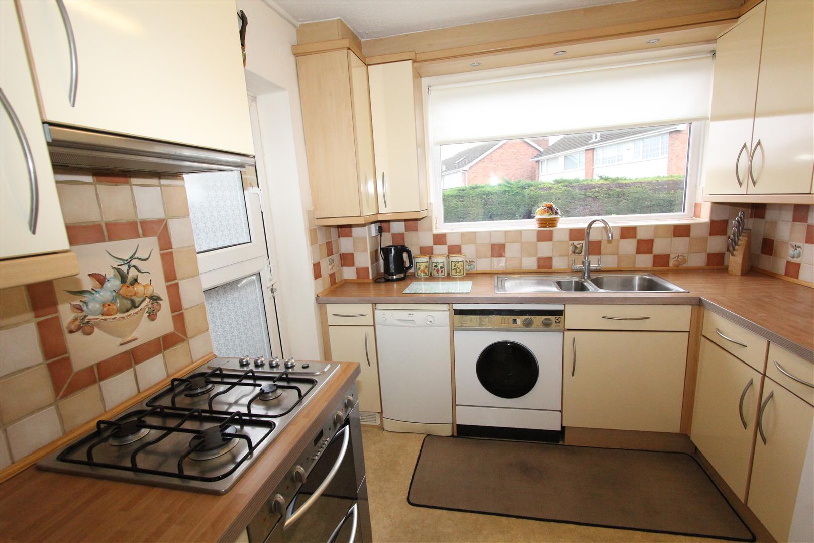 Kitchen - 2.82m x 2.62m (9'3 x 8'7)Window to front. Range of kitchen units with work-tops, one-and-a-half bowl stainless-steel sink unit and tiled splash-back. Electric oven with gas hob and extractor fan above. Space for fridge/freezer. Space and plumbing for washing-machine and dishwasher. Vinyl floor. Boiler cupboard with gas-fired warm air central-heating system. Glazed door to side.