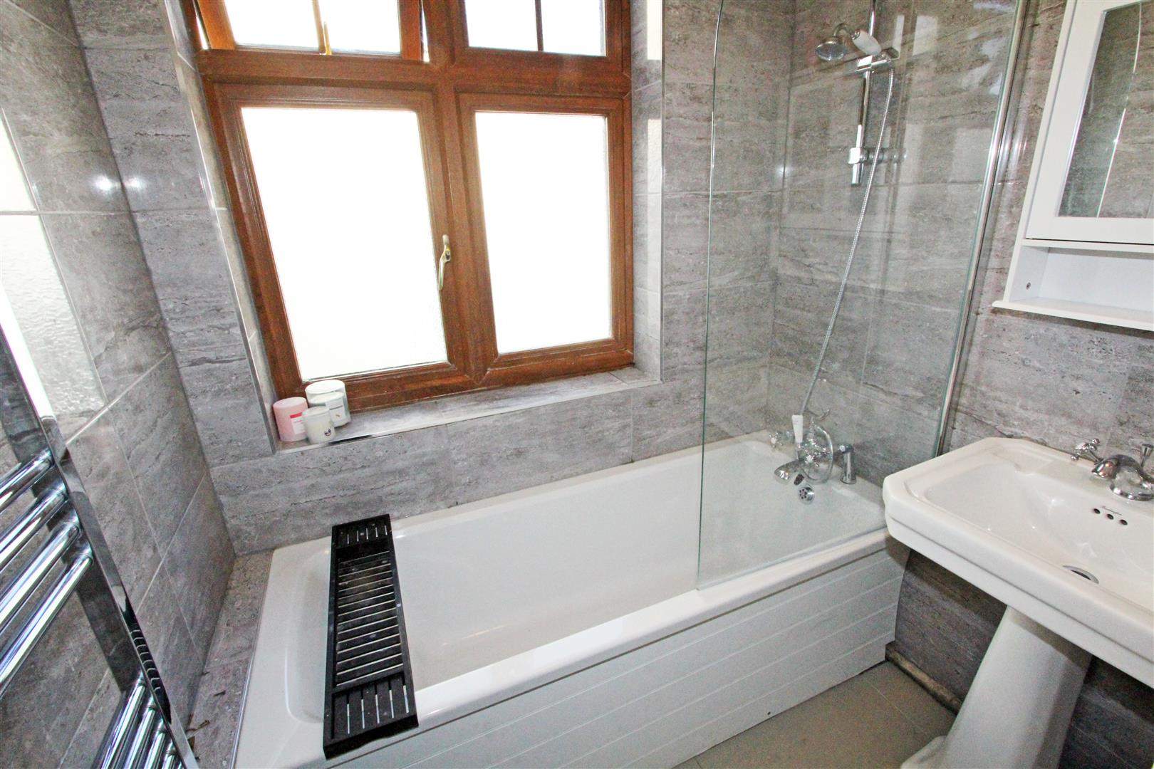 Bathroom - 1.75m x 1.40m (5'9 x 4'7)Frosted window to side. Panel bath with shower and glass shower screen. Wash-hand basin. Tiled walls and floor. Modern heated towel-rail. Dado rail.