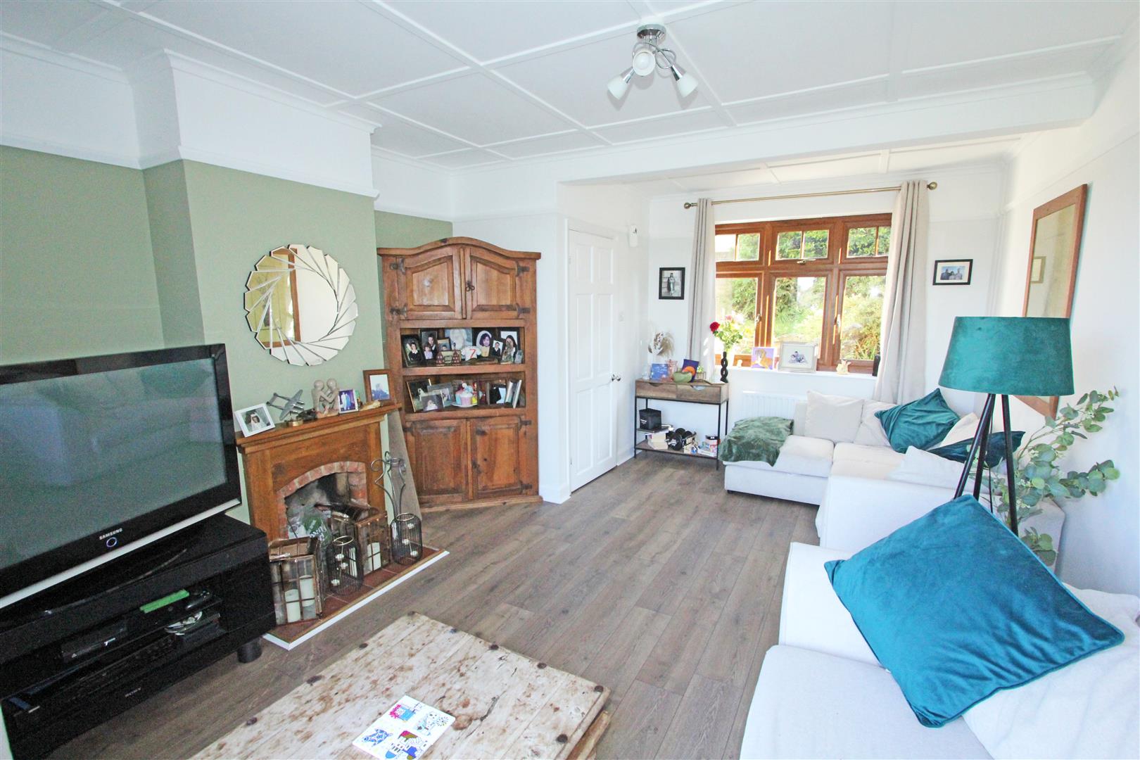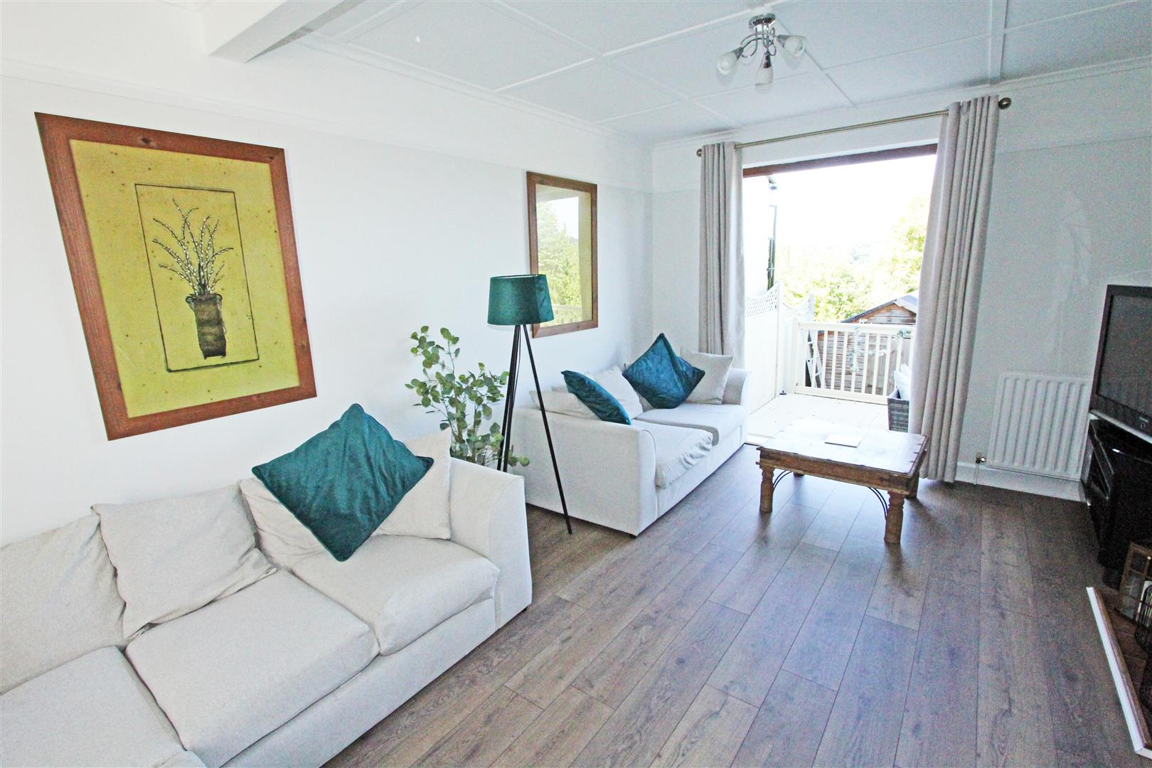 Sitting Room - 4.95m x 3.63m (16'3 x 11'11)Widow to front. Original 1930's fireplace with oak mantel, brick surround and tiled hearth. Wood-effect laminate floor. Picture rail. Ceiling panelling. TV aerial point. Two radiators. French doors out to the raised decking with superb far-raching views.